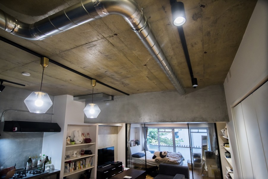 「リノベーションをする前は、リビングの梁に存在感があり二重天井になっていました。天井高を確保するために躯体現しにしましたが、癖の強いインダストリアル系にしてしまうと将来売り出す時に大きく好みが分かれてしまうと思ったので、素材感を活かしつつも普遍的な感じにしました。」(ご主人)