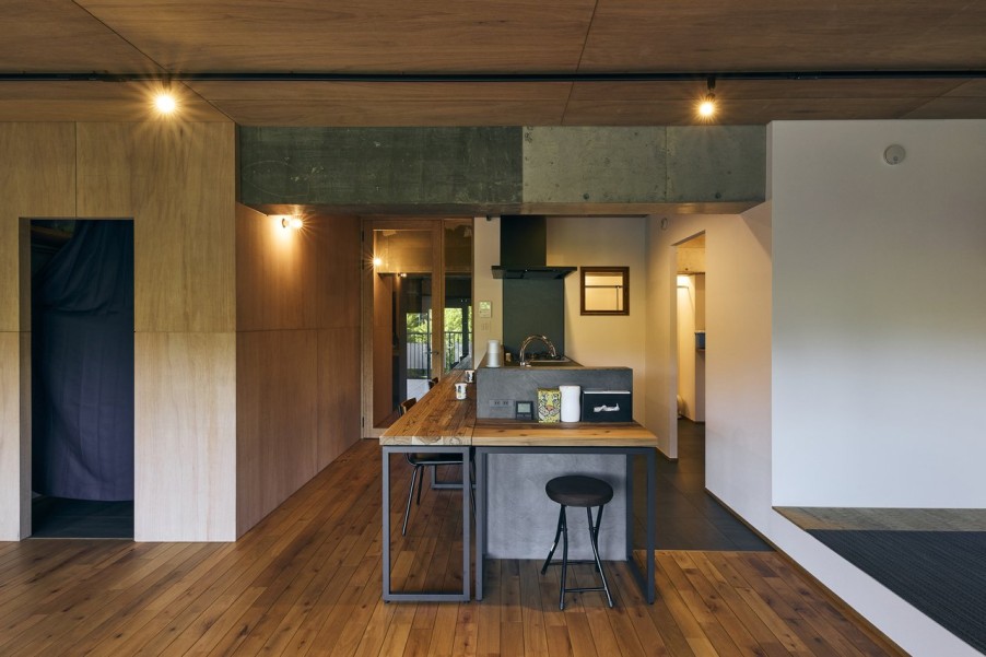 「ダイニングにあるテーブルは屋久杉の木を使って造作してもらいました。2台に分かれていて、キッチンに沿わせてL字に置けばカウンター風、縦に2台並べるとダイニングテーブル風にもできます。キッチンの側面にはコンセントを設置しているので、テーブルの上でホットプレートも使えます。先日は知り合いを呼んでホームパーティーをしました。」(ご主人)