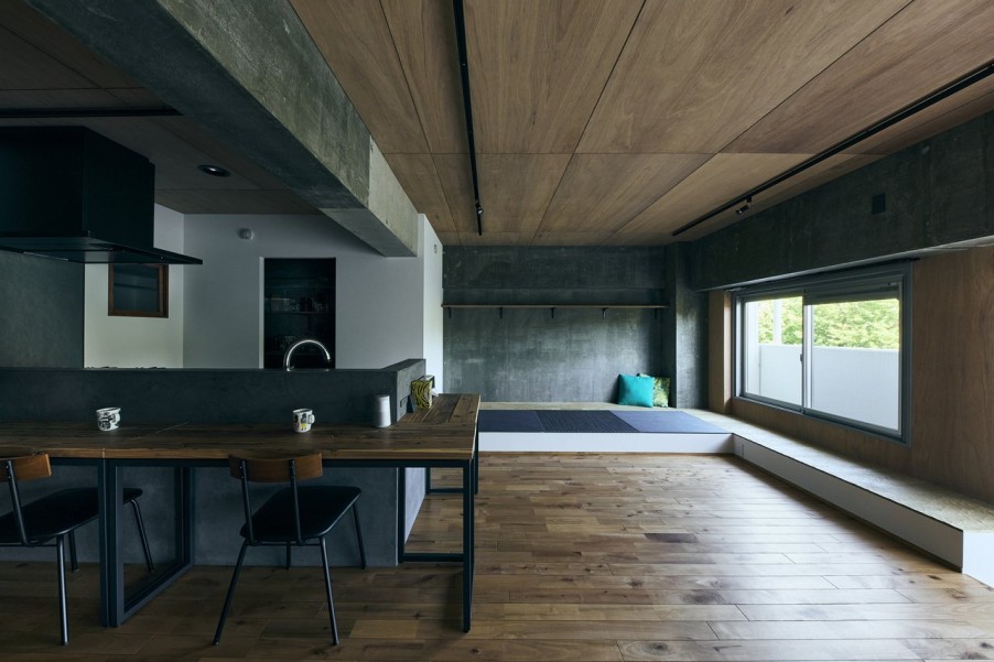 「コーヒーやお酒を飲む時間が日々の息抜きなので、ダイニングは好きなカフェやお店の内装をイメージしました。家全体のイメージとしては、躯体現しにして木目調などの温かみを感じる素材を組み合わせたいこと、黒やグレーなどシンプルな色味を使いたいことを伝えました。リビングの窓からは公園の緑が借景となって、家の中に緑を置かなくても緑を感じられて最高ですね。」(ご主人)