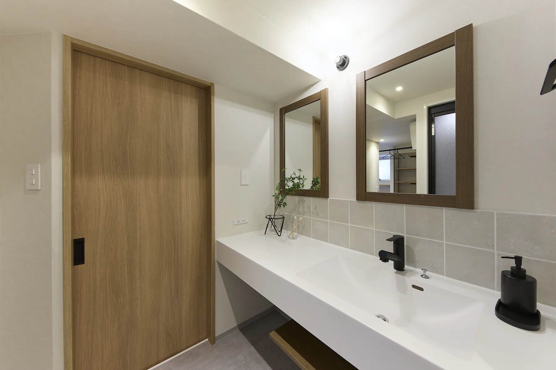 リビングと洗面室の両方へつながる2way動線となっているため、来客時の対応もスムーズになります。