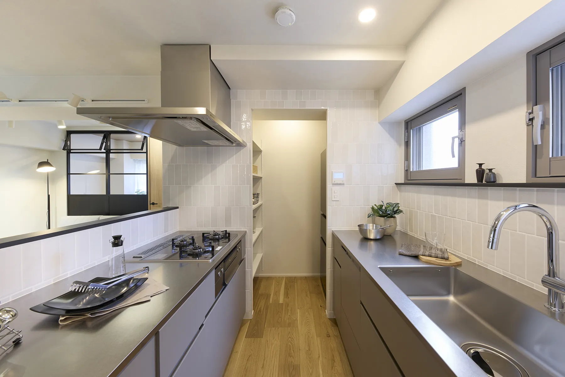 二型のキッチンに加え、ダイニングとリビングそれぞれにテーブルセットを置いても圧迫感のない空間。