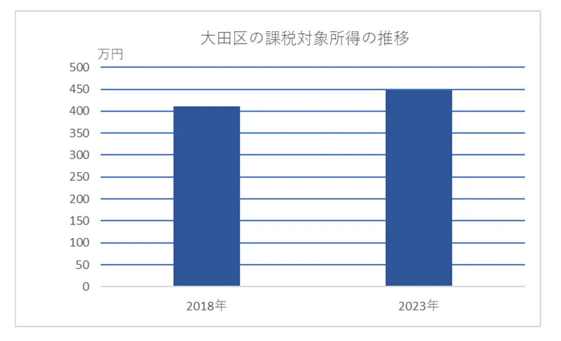 総務省の「社会・人口統計体系」によると、大田区の課税対象所得の合計額を納税義務者数(均等割)で割った課税対象所得の平均は、2018年は411万5,368円、2023年は447万8,808円でした。これは各種所得控除を反映した数字のため、実際の年収や手取り額とは異なりますが、5年間で収入水準がアップしているといえます。