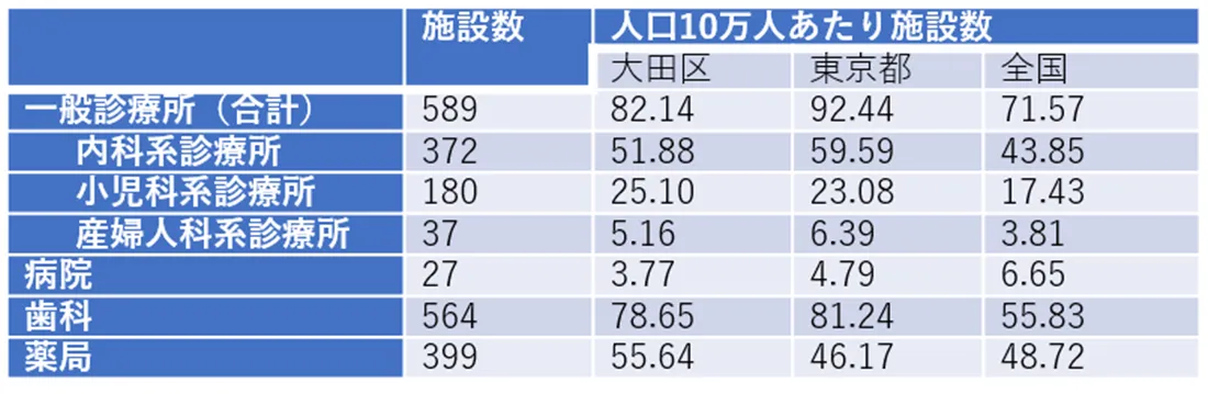 大田区は人口に対する医療施設数は東京都全体の平均に比べてやや低めとなっていますが、小児科系診療所の数については、全国・東京のいずれの平均よりも高くなっています。